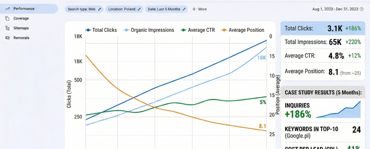 Стратегия масштабировалась по модели локальное SEO для транспортных компаний в Польше с фокусом на конверсию, а не просто рост трафика.