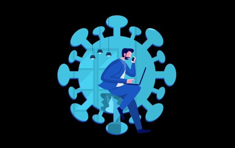 Концепт віддаленої роботи під час пандемії: фрілансер з ноутбуком працює всередині символічної молекули вірусу (2)